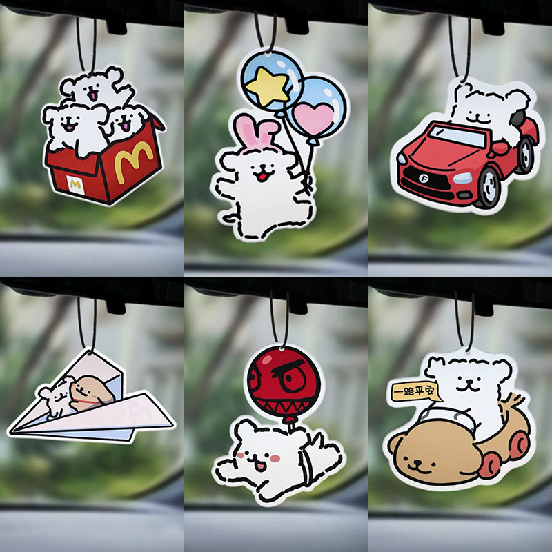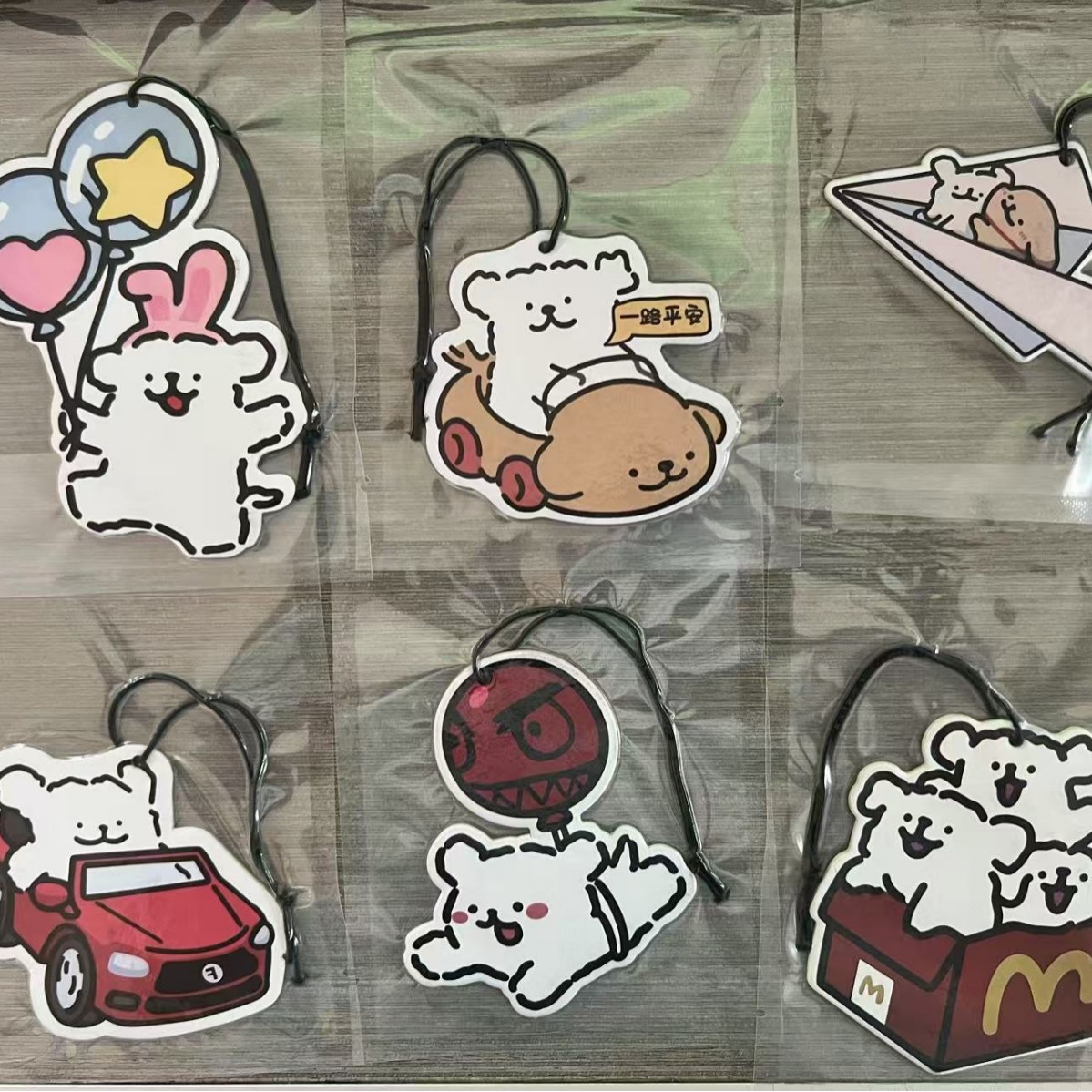 Multiple styles of air freshener cards with different scenes are provided. Car owners can change them according to their mood, preferences, or special occasions like festivals. For example, on Valentine's Day, they can hang the style with the bear holding a heart-shaped balloon to create a romantic atmosphere; on Children's Day, they can choose the style with the bear flying a paper airplane to bring joy to children.