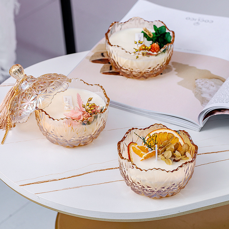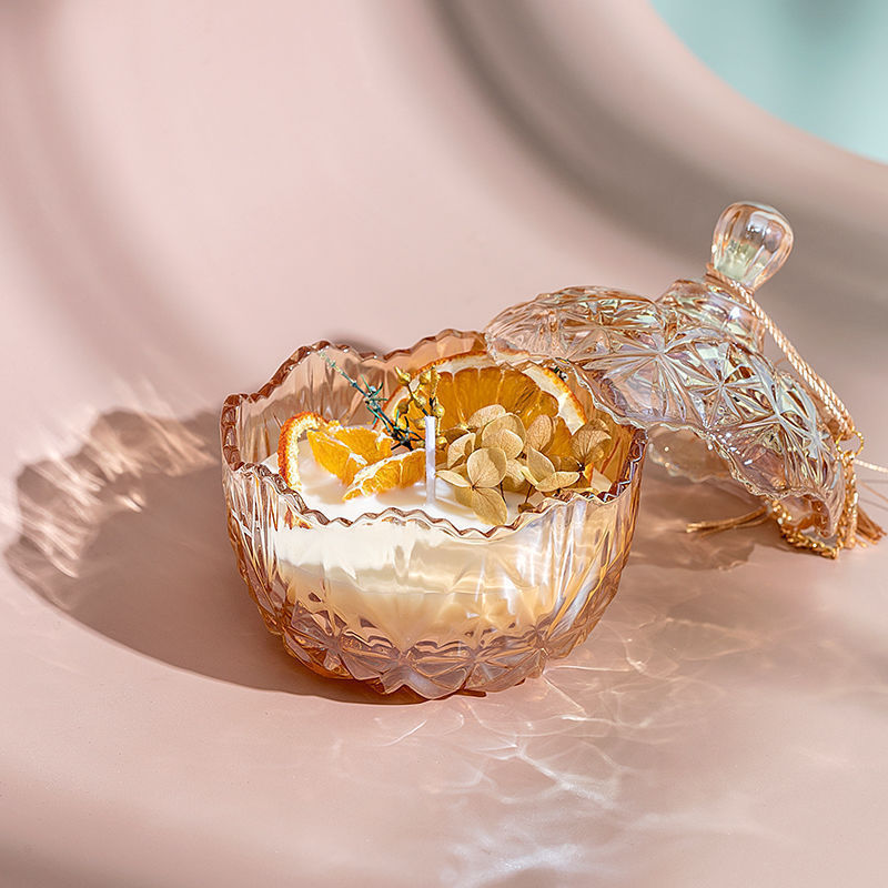 The candles are made from natural plant wax and paired with high-quality essential oils. They burn smoke-free and release a pure aroma. Different dried flower combinations correspond to different scents. For instance, the pink flower version might have a delicate rose and lavender fragrance, which is soothing and helps with sleep. The orange slice version could have a refreshing citrus scent, invigorating the mind. The aroma spreads slowly and evenly through the space structure of the glass cover, avoiding a pungent smell and allowing the sense of smell to be healed in a comfortable atmosphere.