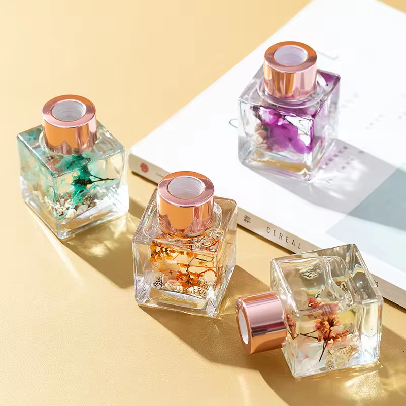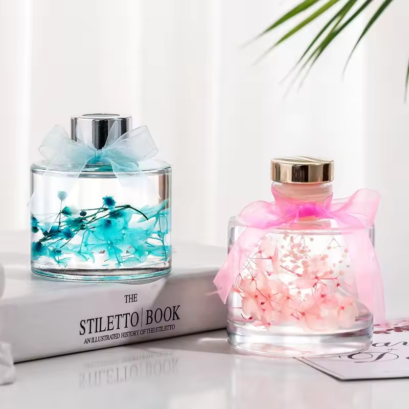 The transparent glass bottle body is paired with a golden cap, simple yet luxurious. The neck is tied with brightly colored ribbons in blue, yellow, pink, red, etc., adding a lively touch to the aromatherapy and it can be used as a home decoration to embellish the space.